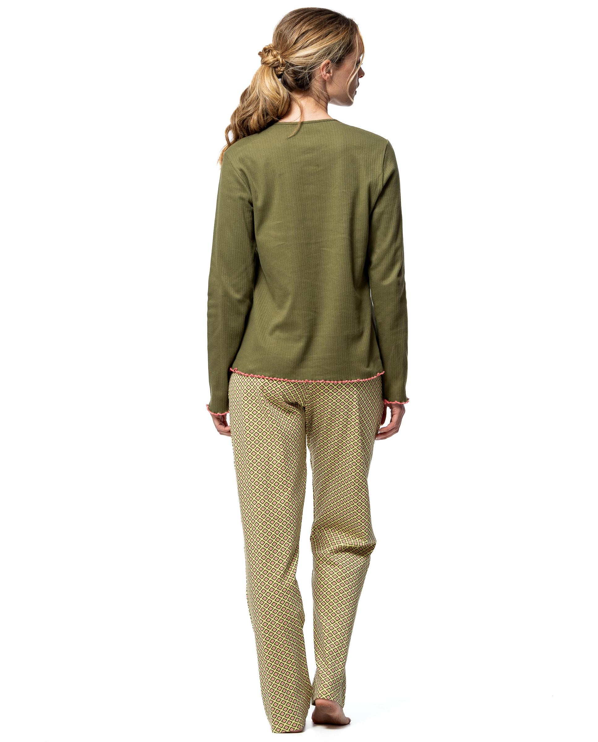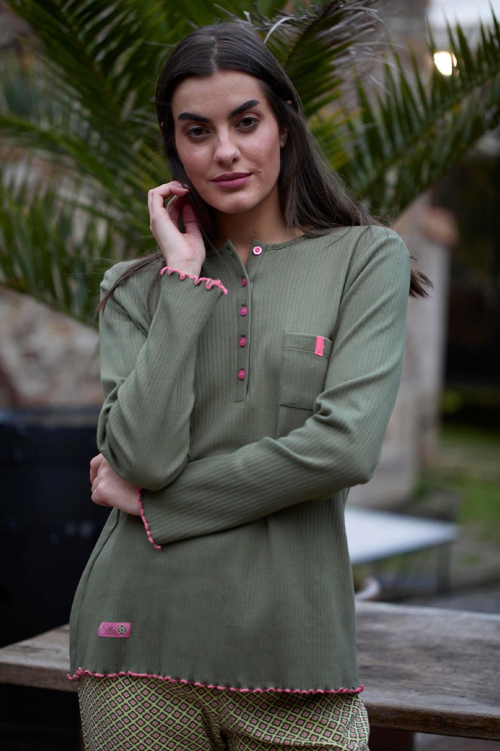 Pijama Señoretta 100% algodón, ideal para quienes buscan suavidad natural y confort en cada movimiento. Su original combinación de camiseta verde con detalles en rosa y pantalón estampado lo convierten en una opción con estilo propio. Perfecto para disfrutar de tus momentos de relax en casa con comodidad total.